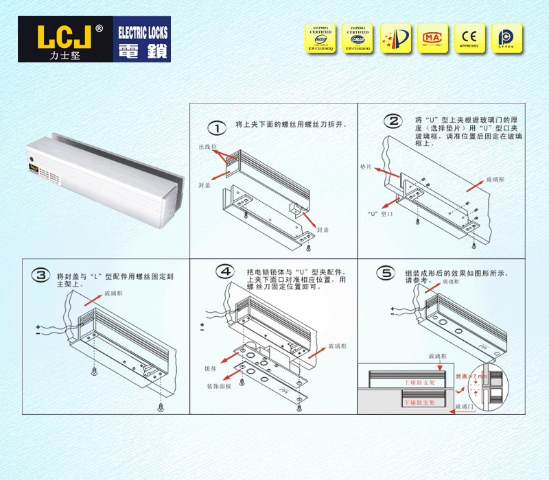 配合电插锁EC200系列、EC200A系列、EC200B系列、EC200H锁体,应用于8~12mm厚上无框玻璃门(15mm玻璃特定) |